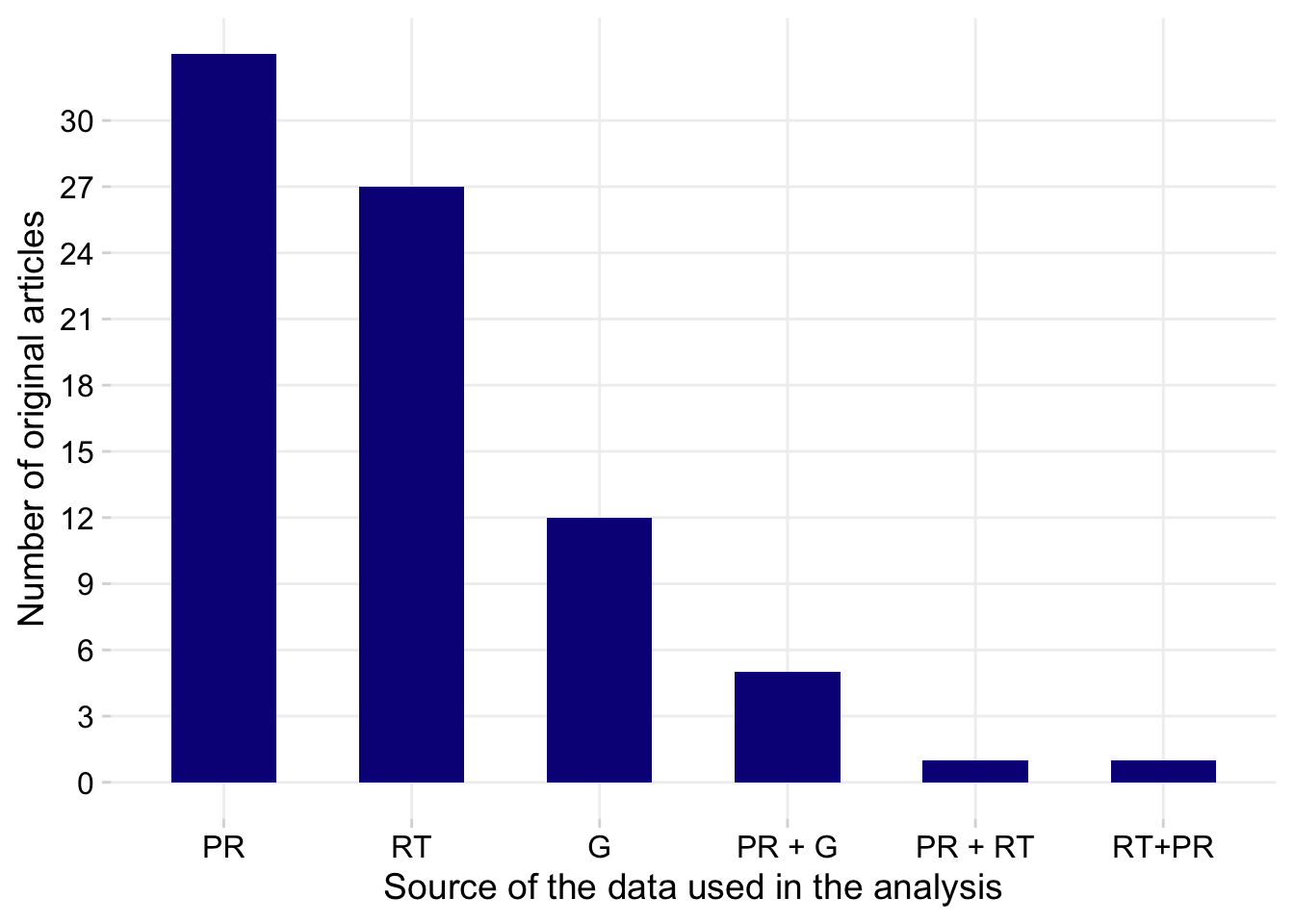 labs(x = "Source of the data used in the analysis", y = "Number of original articles")