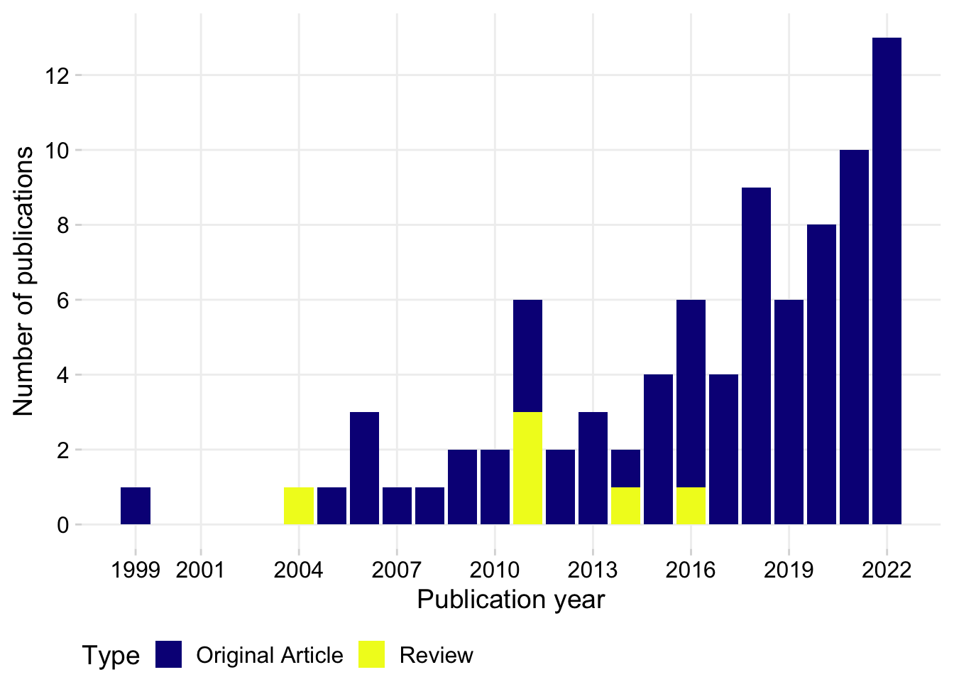 labs( x = "Publication year", y = "Number of publications")