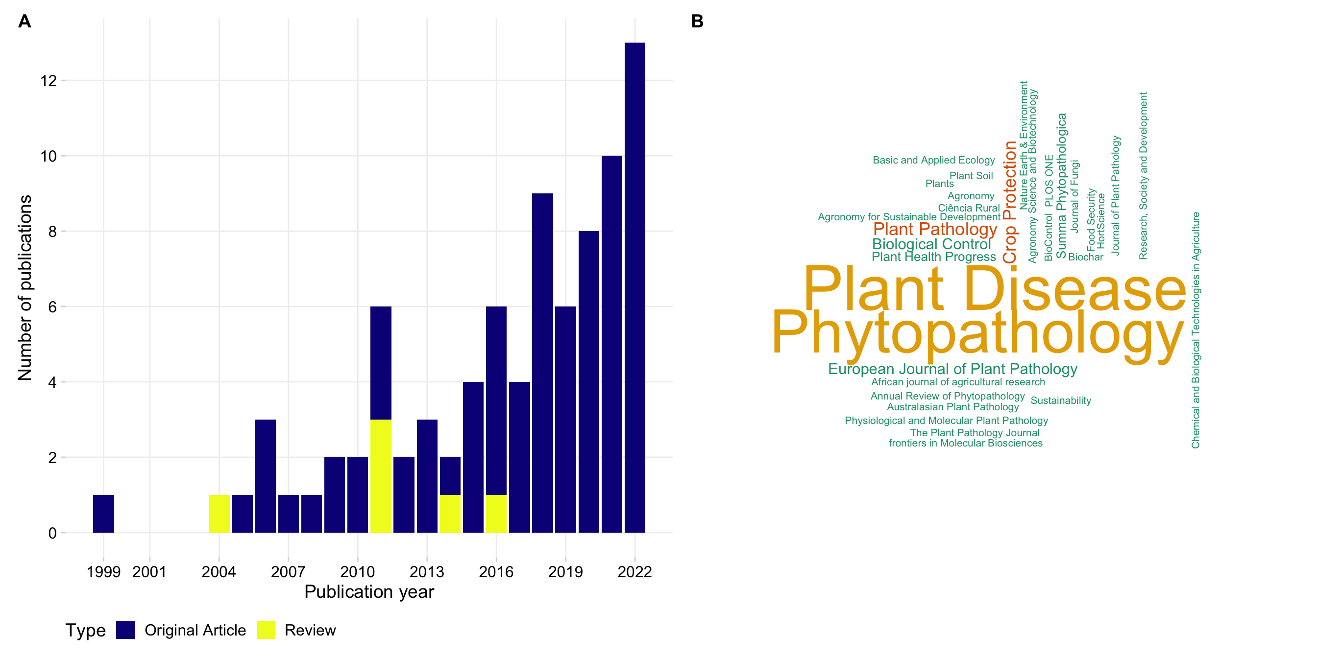p1 + wrap_elements(panel = ~wordcloud(words = tab2$journal, freq = tab2$n, min.freq = 1, max.words=200, random.order=FALSE, rot.per=0.25, colors=brewer.pal(6, "Dark2"))) + plot_annotation(tag_levels = "A")