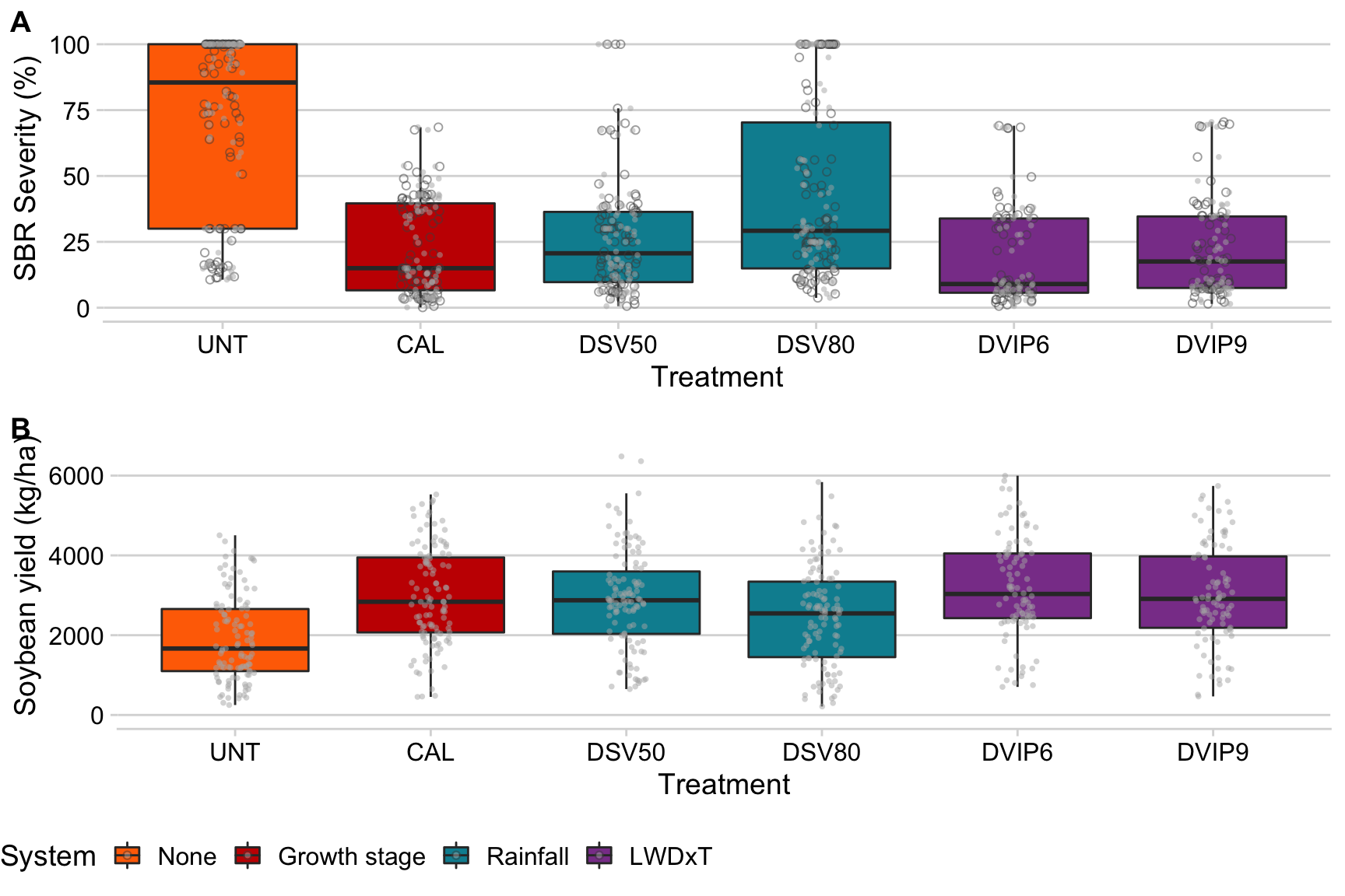 Here we will produce a boxplot to depict the variation in severity for each of the treatments. It will provide an overview of the performance of the systems, irrespectively of the number of sprays.