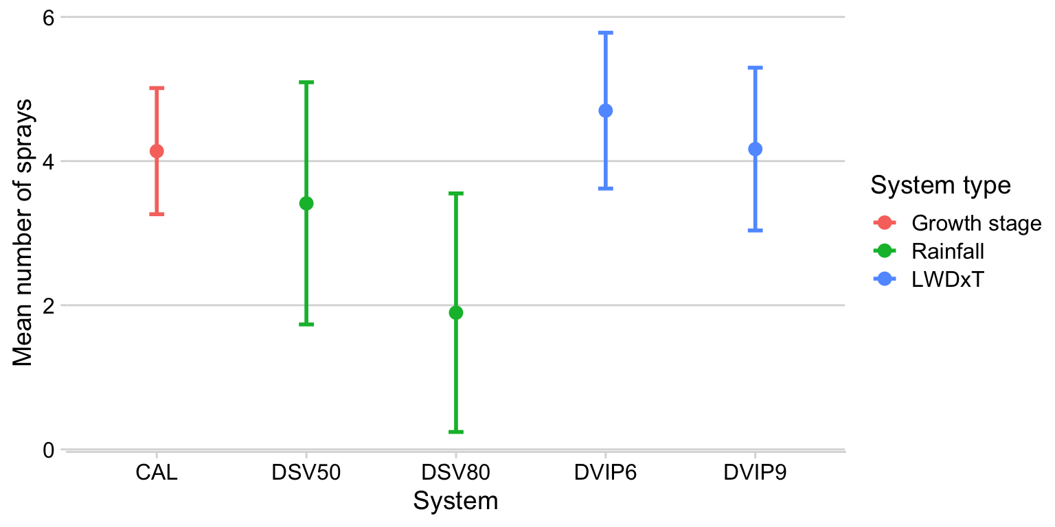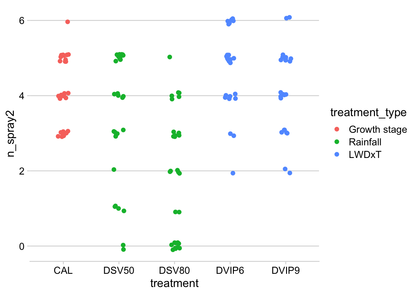 Let’s recode the names of the treatments and assign them to three criteria: calendar or growth stage, rainfall and leaf wetness x temperature models. This category will be used to enhance visualization.