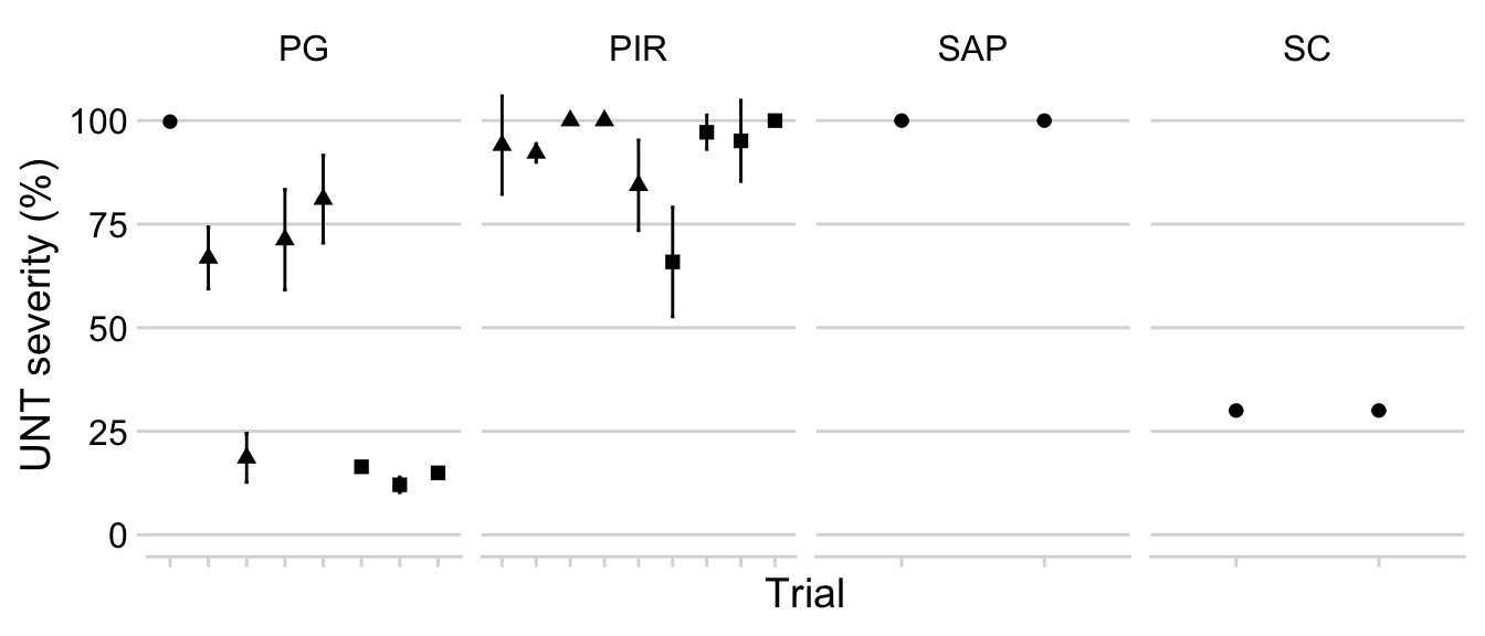 We will filter the untreated check plots and inspect the variation in the mean and standard deviation of disease severity for each trial. This provides an overview of the “disease pressure”.